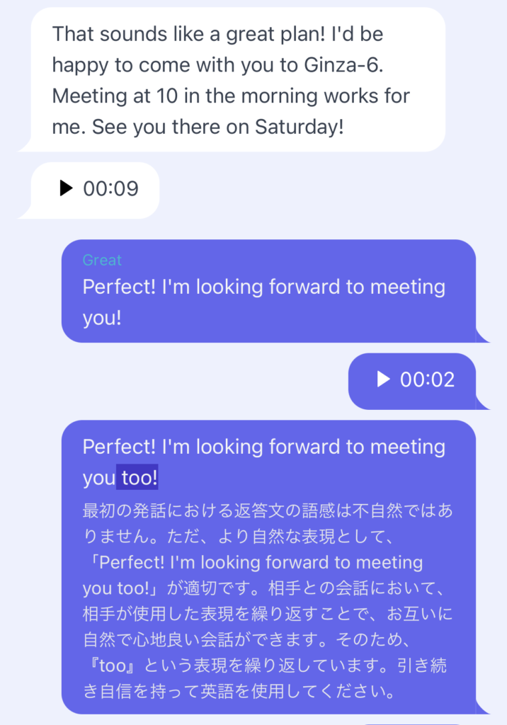 GPT-4ベースの教材としてはSpeakしか使ったことがないので、その感想はSpeakに対する感想になってしまいますが、見当違いな反応でイライラすることがなく、とてもナチュラルに感じました。