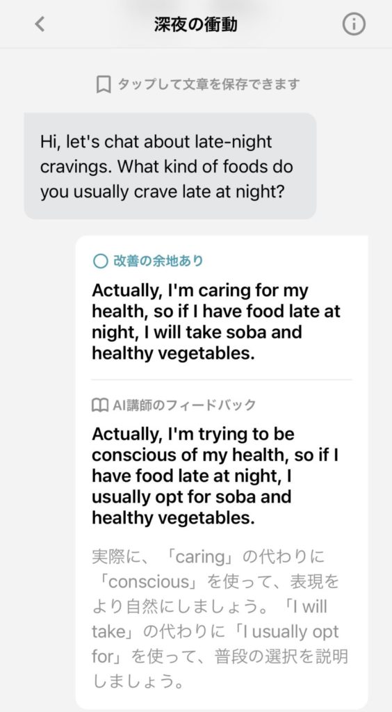 英語の喋りに慣れていないと、私のようにごく簡単な内容でもすごく慌てるので、不完全な文のオンパレードになります。そんな時でも発話ごとに丁寧に改善提案を示してもらえるのがありがたく感じます。また、表現の代替案だけでなく、日本語による解説もついてくる極楽仕様。素晴らしい!